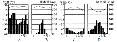 本题解析:本题考查气候类型的判断。A图终年高温,降水集中于夏季,判断为热带季风气候;乙图最低月温在0°C以上,终年降水均匀,判断为温带海洋性气候;C图最低月温在0°C以下,降水量集中于夏季,判断为温带季风气候;D图终年高温多雨,为热带雨林气候。