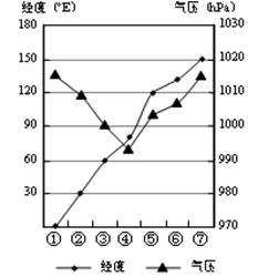 5、单选题 下图为北纬31°纬线上7个地点某月的平均气压分布图,读图完成下题。