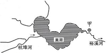 材料一 :巢湖上游支流杭埠河发源于大别山区,经巢湖由裕溪河注入长江。下图为 巢湖流域水系局部图