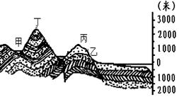 小题2:我国南方地区位于外流区,湖泊多属于淡水湖,A错误;图示乙地位于山区到平原地区的过渡地带,故可能形成山麓冲积扇,B正确;丙位于背斜的顶部,不可能形成泉水出露,C错误;常绿硬叶林分布于地中海气候下,不符合我国南方地区,D错误。