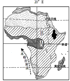 本题解析:本题考查非洲的自然带分布。(1)图示A位于赤道附近,为热带雨林带。B位于雨林两侧,为热带草原气候。(2)从赤道向南北两侧,则自然带呈南北有规律的递变,属于纬度地带性规律,以热量条件为基础。(3)寒流对沿岸气候的影响降温减湿。