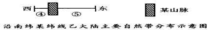 本题解析:试题分析:从图甲中明显可以看出在北半球大陆东西两岸的自然带相同,这一定是温带落叶阔叶林带,从而可以判定①、②、③分别对应的自然带是温带荒漠带、温带草原带和温带落叶阔叶林带。又因为①、⑤两个自然带相同,结合图中的信息可以判定④也是温带落叶阔叶林带,图中的山脉为安第斯山的可能性极大。图中①自然带的形成是因为深居内陆、气候干旱而形成的;而④的形成是因为其地处安第斯山的东侧,盛行西风的背风坡。故选D