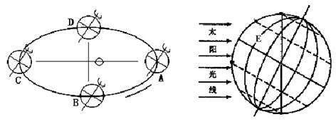 (1)在左图中用箭头在短线处标出地球的公转方向,在右图中用斜线绘出夜半球的范围。(2分)