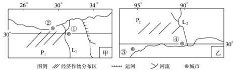 本题解析:小题1:从经纬度位置和海陆轮廓形状分析,Pl位于尼罗河下游地区,其主要经济作物是棉花;P2位于美国南部,该区域是美国的棉花带。故两地皆发展以棉花为原料的纺织工业。小题2:Ll是尼罗河,该河注入地中海,该海区冬季多雨。