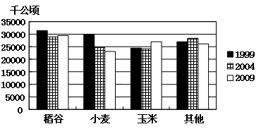本题解析:本题考查我国的粮食生产和读图分析能力。小题1:根据图示粮食作物的播种总面积略有下降。