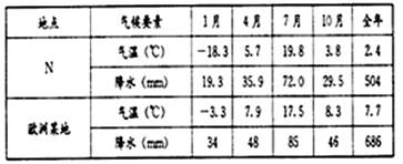 (2)与同纬度欧洲某地相比,N地气候具有明显的_______(海洋、大陆)性。(1分)请用材料2加以说明。(3分)