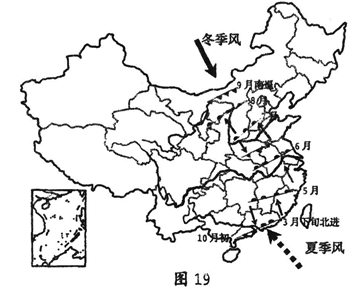 5、综合题 第16届亚洲运动会将于2010年11月12日至27日在广州举行。图19是我国东部地区一般年份季风进退情况示意图,读图回答下列问题。(12分)