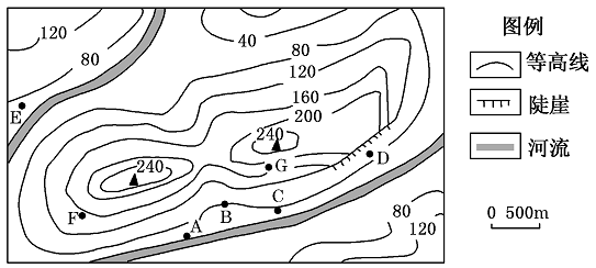 (1)陡崖顶部的海拔高度为(200m,240m),而底部的海拔高度为(80m-120m),利用交叉法可计算出都一般相对高度H的范围为(80m,160m),故选B.