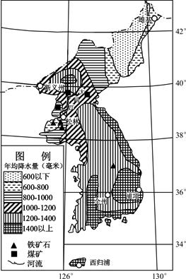 (1)结合图示信息,简述朝鲜半岛年均降水量的主要特征。(4分)