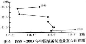 本题解析:本题考查读图分析能力。通过对图表的阅读,可以看出图表中所标注的中国装备制造业中心位置一直都在中国几何中心的东南部和大致向东南方向移动。而东西方向上的移动幅度一直比较小,变化幅度也一直都在116°E范围内,但南北方向却在33.5°N-31°N之间的范围内变化。
