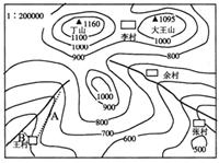 本题解析:(1)本题根据等高线判断地形。其中张村和余村等高线都是向高处弯曲,地形是河谷。李村地形是鞍部。(2)张村海拔400米,丁山山顶的海拔1160米,计算相对高度。根据等高线的疏密程度判断坡度。(3)气温是海拔上升100米,温度下降0.6℃。(4)已知比例尺、图距,求实际距离=图距/比例尺。(5)输水路线的要求是沿线平坦,水能够自流等条件根据等高线判断地形。