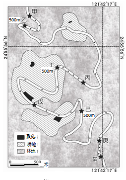 2、单选题 某自行车爱好者骑行自行车从甲地到辛地,车行全程使用力气维持不变,车速变化完全受坡度左右。车上配有全球定位系统(GPS),每30秒自动接收定位一次(图中小黑点)。读骑行路线图(图中乙、丁、己的海拔为500米),回答第以下问题。