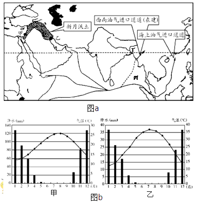 材料二 “我国石油进口部分通道示意图(图a)”和“甲、乙两地气候资料图(图b)”。