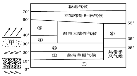 (1)图中甲气压带的名称是 ;根据图中气压带、风带的位置,可以判断上图所示是北半球的 (季节)。(2分)