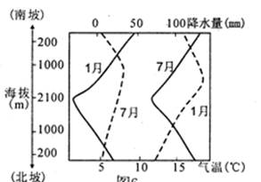 4、单选题  下图为某山脉南、北两坡气候资料图,实线表示气温,虚线表示降水。据此回答下列各题。