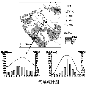 【小题3】B城附近河段处于西欧,从气候统计图看,降水期较长,河流的汛期也较长,A对;西欧气候湿润,植被覆盖率高,河流含沙量较小,B错;该河段流经平原区,流速较慢,C错;从气候特征看,全年在0℃以上,河流无结冰期,D错。答案选A。