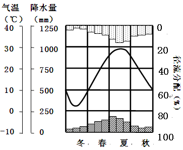 1、单选题 图表示某河流水文测站春夏秋冬四季气温、降水量和径流分配状况。