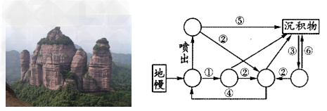 2、单选题 “中国丹霞”已被正式列入《世界遗产名录》。下左图为广东丹霞山地貌景观,图示山体主要是红色砂砾岩,看去似赤城层层,云霞片片。古人取其“色如涯丹,灿若明霞”之意,称之为丹霞山。下右图为地质循环示意图。丹霞地貌岩石类型形成的地质作用对应于地质循环示意图中的