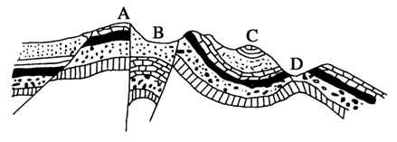 (1)A、B、C、D四处中属于背斜的是________,属于向斜的是__________,属于断层的是 ________。