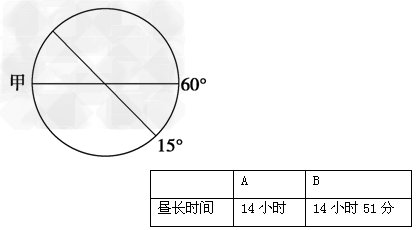 5、单选题 下图中直线为经线、圆圈为纬线,该纬线穿过两块大陆的北部。纬线圈中心点处太阳高度为20°,下表为当日A、B两地昼长时间。据图完成1~3题。