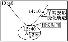 2、单选题 2011年12月22日,我国某中学地理小组进行太阳高度和当地经纬度观测。操作方法是:在操场上选择一点A处,垂直立起一根竹竿(竿长2米),画一个半径为2米的圆圈,将观测到的竿端点在地面所投影的变化记录在操场平地上。下图为“竿端投影变化图(均为北京时间)”,据此回答下列问题。