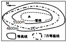 【小题2】该处山脉七月等温线为3℃>0,可知为北半球的山脉且海拔高于5500米,故C正确
