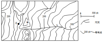 1.图中甲等高线的数值可能是2.图示河流L落差的最大值可能是3.乙河段有一漂流场所,夏季游客为了避免过多的太阳辐射,最佳的游玩时间段是