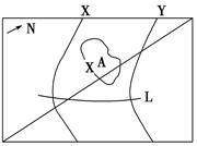 5、单选题 读“某地局部图”,图中X、Y为等高线(等高距为100米),L为河流,对角线为经线。据此回下列各题。