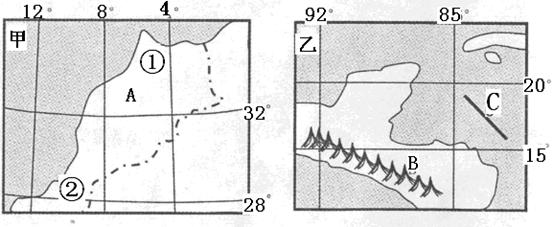(1)对比分析甲、乙两图比例尺的大小并说明判断理由,简要说明A国的地理位置特征。(4分)