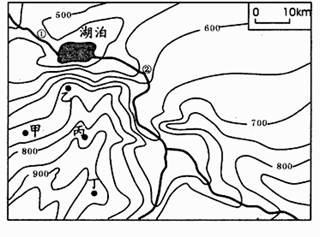 【小题2】考查比例尺量算问题,湖泊大致呈矩形,长约1cm,宽度约0.5cm,10km×5km=50平方千米。选C。