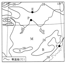 【小题3】等温线在E、F两地的走向特点及原因是E地等温线向低纬突出,主要受地形影响;F地等温线大致与海岸线平行,主要受海洋影响。