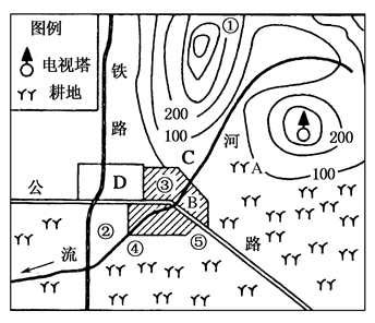 本题解析:本题考查学生地理基础知识——等高线的判读和应用及工业布局、城市规划的综合分析应用能力。水库坝址应在等高线图上盆地的峡谷出谷处,即俗称“口小肚子大”的地方,图中应建在与城市相通河流的两个山头之间(即两条100米等高线最贴近的地方)。火电厂污染大气,应建在城市的下风向或与盛行风向垂直的郊外,我国东部是季风区,冬季盛行西北风,夏季盛行东南风,因此火电厂应布局在东北和西南两个方向,东北是河流的上游,所以应布局在西南方向的②处;印染厂严重污染水源,应建在河流下游的④处,并要考虑设置配套的污水处理厂;面包加工厂污染小,设置在靠近消费市场的市区③处;疗养院设置在景色优美的山麓①处;综合仓库货物运进运出的运输量大,建在靠近公路和铁路的交通最便利的D处;商贸大厦宜建在市中心繁华闹市B处,以取得最大的经济效益。