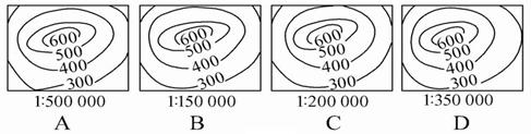 3、单选题  图下为四幅图幅相同的等高线(单位:米)地形图,图中的等高距相同,水平比例尺不同,请判断坡度最缓的是