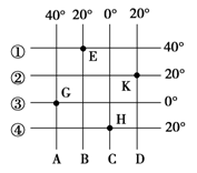 【小题3】从20°W向东到160°E是东半球,赤道以北是北半球,0°到30°纬线间是低纬度。所以图中只有K点符合,D对。