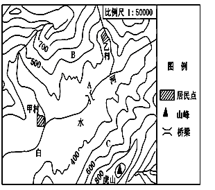 第(1)题,根据图中的等高线可判断出虎山的高度为900米~1 000米,桥梁(A)的高度为300米~400米,因而两者的相对高度为500米~700米。