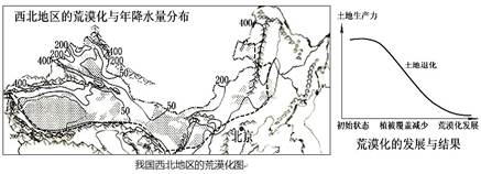 3、综合题  读 “我国的西北地区荒漠化”及“荒漠化发展与结果” 图,回答下列问题:(11分)