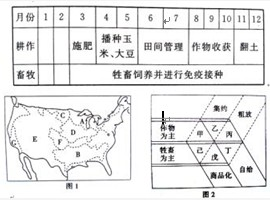 4、单选题 今年60多岁的杰恩和安娜夫妇经营了一个农场,杰恩说“三四十年前农场常有许多来自西部牧场的牛群在此育肥,并就地屠宰,当时大家真是忙坏了,近年这种盛况少见多了。”结合其工作年历(见下表),回答下题。1.杰恩和安娜的农场最可能位于图1中的2.该农场近年来自西部牧场育肥牲畜数量减少的原因主要是