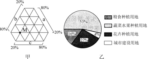 1.根据三角坐标的读法,可读出M地农业结构为,花卉占20%,蔬菜水果占60%,粮食点20%。因此该地以蔬菜水果为主要产业,再结合土地利用结构。该地为城郊农业,以市场为主要区位。