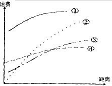 5、单选题 读下图,四种不同运输方式的运费与距离的相关变化图,回答1—3题。