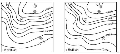 2、单选题 下图示意北半球某区域2012年1月5日14时和6日8时海平面气压(单位:百帕)分布,读图完成下列问题。