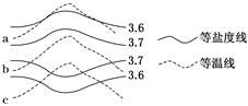 5、单选题 表层海水盐度分布的规律是:从南北半球的副热带海区分别向两侧的低纬度和高纬度递减。受洋流影响,同一纬线上暖流经过的海区盐度偏高,寒流经过的海区盐度偏低。读“某海区表层海水等盐度线和等温线图”。回答问题。