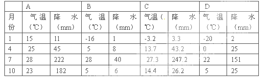 1、单选题 下表中的四个地点分别位于我国的四个地区内,读它们的部分气候资料,回答下列各题