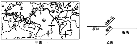 D、乙图所示板块交界处地壳比较稳定