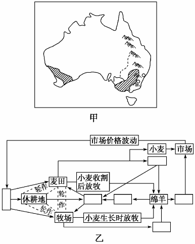 1、综合题 下图为“澳大利亚小麦一牧羊带分布图”和“墨累一达令盆地混合农业良性生态系统图”(该农业生产中麦田、牧场、休耕地可以轮作),读图完成下列问题。