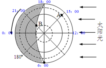 【小题3】B点3:00日出,21:00日落,故B点的昼长时间是(21-3)=18小时。