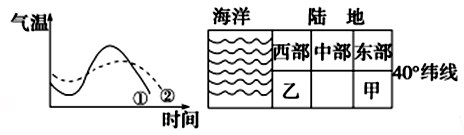 3、单选题 下图中的左图是某沿海地区两地气温随时间变化曲线示意图,右图是某区域海陆分布图。读图回答下列各题。