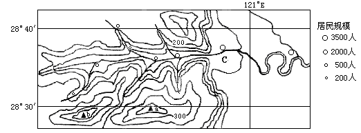 (1)图示等高距为50米。大坝拟建高度151m,水库大坝适合修建在峡谷处,即图中C处向上一点的位置为峡谷,水库淹没区域内有500人的居民区2个,2000人的居民区1个,200人的居民区1个,建水库需迁移3200人。