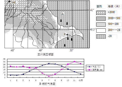 (4)读B城气候图,说出B城与我国同纬度地区相比冬季气候特点及原因 。(4分)