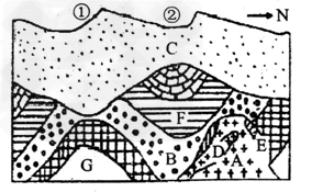 2、单选题 下图为某地地质剖面图,其中C为沉积物,B、F、G为沉积岩,A、D为不同时期的岩浆岩,E为变质岩。据此回答1~2题。