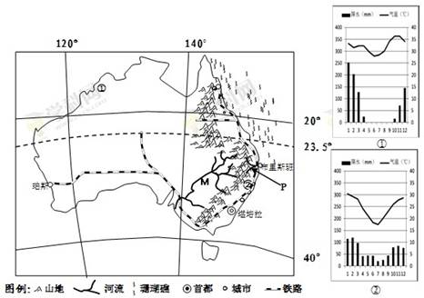 (3)分析澳大利亚东南部沿海港口运输比澳大利亚东北部沿海更为发达的原因。(8分)